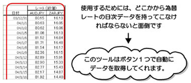 一般の無料ツールと異なり、どこからか為替レートのヒストリカルデータを取得して入力する手間がいりません。すべて分析ツールが自動で日次データを取得してくれます。