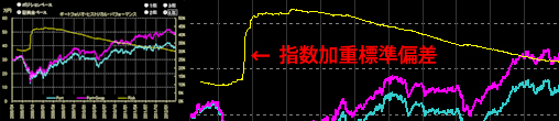 単純計算でもとめた標準偏差と違い、マーケット変動に対して敏感に反応しているのがわかります。リーマンショックのような突発的な大暴落に対して、非常に有効な防衛指標となります。